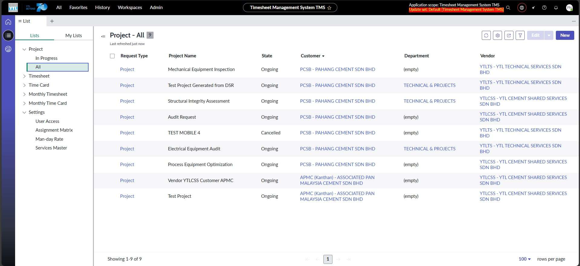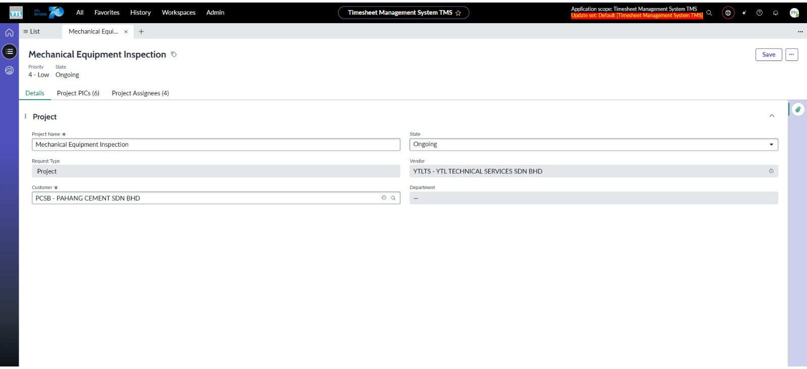 Pengguna yang terdiri daripada Department Admin dan Department HOD (Head Of Department), dapat mengakses senarai projek melalui Project Listing. Setiap projek yang dipaparkan sama ada merupakan permintaan projek yang diluluskan melalui Department Service Request atau projek yang dicipta oleh Department Admin / Department HOD melalui Timesheet Management System. Pengguna hanya dapat melihat projek yang berkaitan dengan Syarikat (Vendor) mereka berdasarkan akses pengguna yang telah ditetapkan. Setiap projek dilengkapi dengan maklumat terperinci, termasuk senarai PIC (Person In Charge) untuk setiap jabatan, serta senarai Assignee (Engineer) yang berperanan dalam projek tersebut.