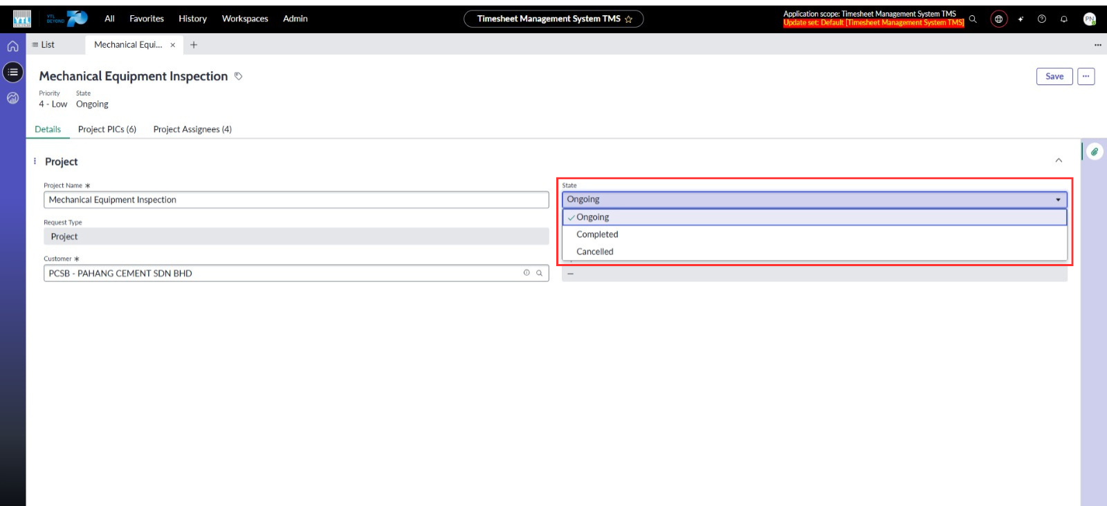● Tetapkan medan Projek dihadkan kepada senarai projek yang telah ditugaskan kepada pengguna melalui “Project Assignee” dan status projek “Ongoing” sahaja.