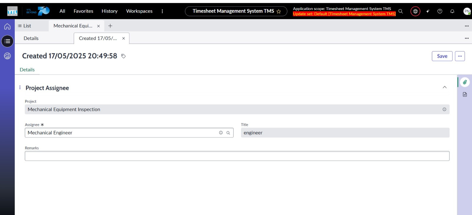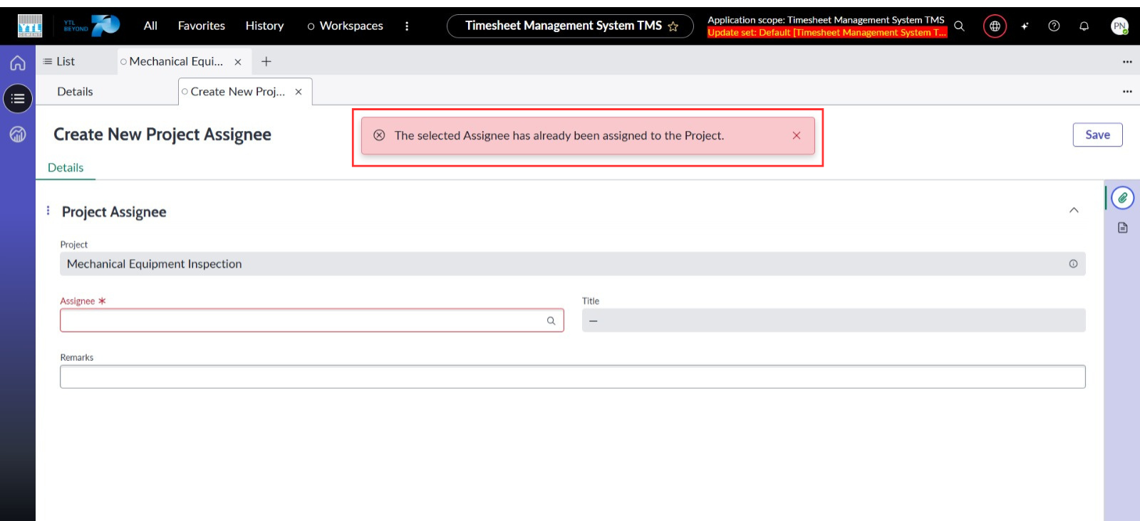 ● Cipta borang baharu Project Assignee dengan medan iaitu Projek (rujukan kepada Projek), Penerima Tugasan, Jawatan dan Catatan (Remark).