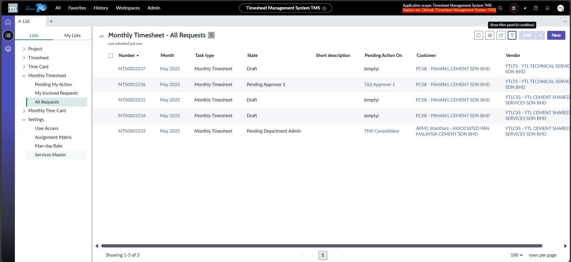 Assignment Matrix Listing hanya boleh diakses oleh Admin dan digunakan untuk menetapkan Workflow Matrix bagi pelanggan (Customer) mengikut syarikat (Vendor). Fungsi ini penting untuk menentukan hierarki atau peringkat pengguna yang terlibat dalam proses kelulusan Monthly Timesheet. Melalui penetapan ini, sistem dapat mengenal pasti aliran kelulusan yang betul mengikut struktur organisasi setiap pelanggan (Customer) dan memastikan proses pengesahan dan kelulusan dijalankan mengikut peranan yang ditetapkan.