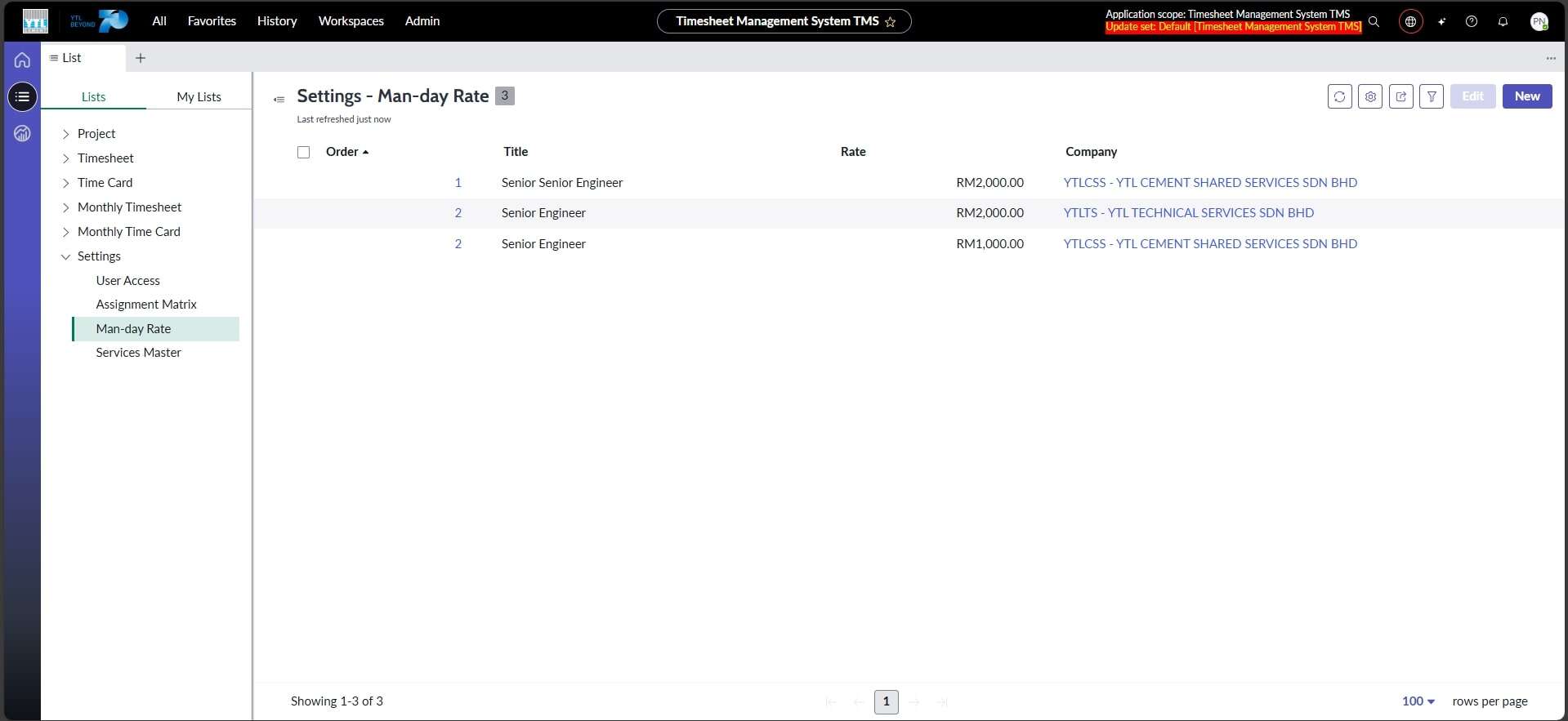 Modul ini direka bagi memudahkan pengurusan Kadar Man-day pengguna yang digunakan untuk tujuan pemantauan dan pengebilan berdasarkan data Timesheet. Akses kepada modul ini terhad kepada Department Admin dan Department HOD bergantung kepada syarikat yang ditetapkan dalam akses pengguna. Kadar Man-day ditentukan mengikut jawatan pengguna dan digunakan dalam penyediaan laporan Monthly Timesheet. Pelaksanaan modul ini membantu memastikan ketepatan kos, meningkatkan kecekapan pemantauan, dan menyokong pengurusan sumber secara lebih sistematik.