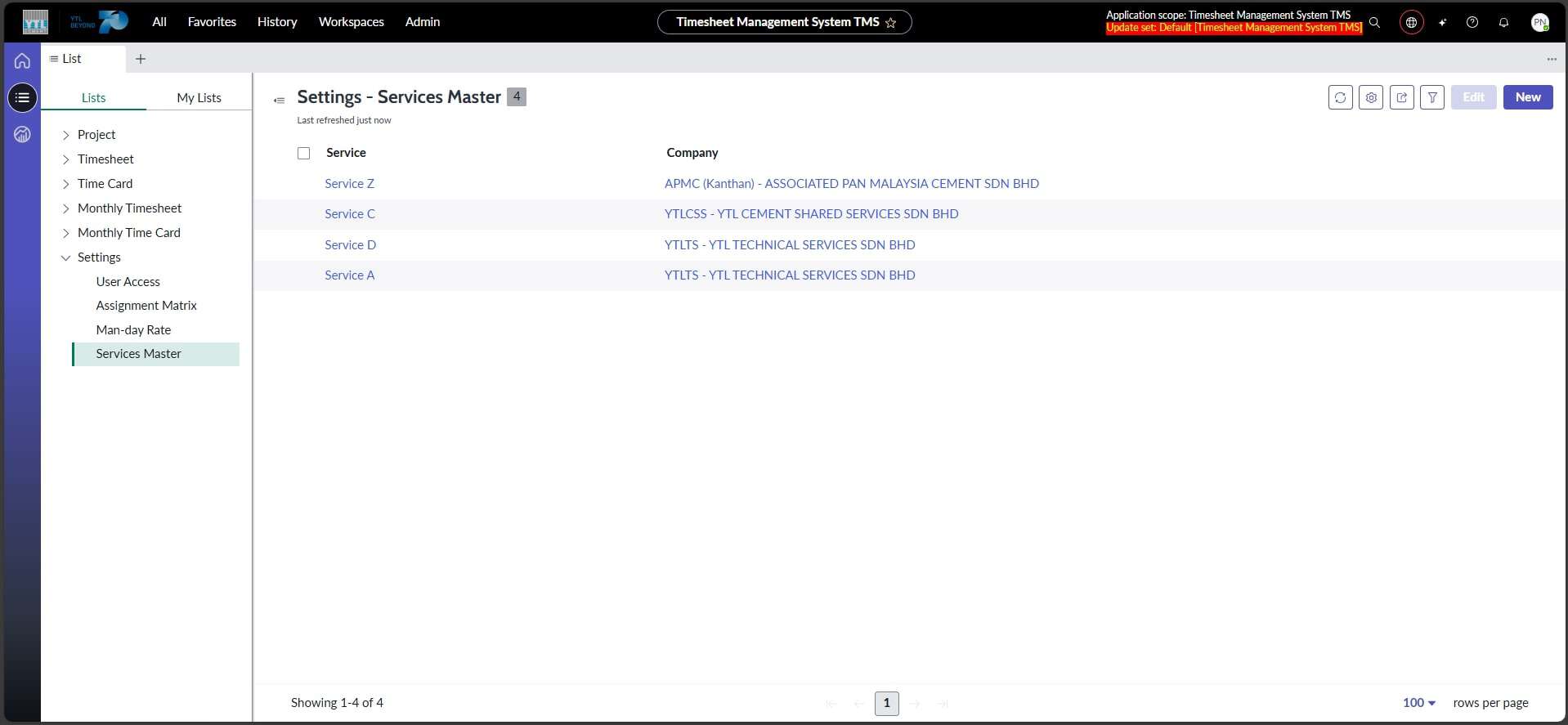 Modul ini dibangunkan bagi mengurus senarai servis yang berkaitan dengan syarikat dan penggunaannya dalam sistem Timesheet. Akses kepada modul ini terhad kepada Department Admin dan Department HOD bergantung kepada syarikat yang ditetapkan dalam akses pengguna. Senarai servis ini akan digunakan oleh pengguna semasa melengkapkan Timesheet dan Time Cards. Paparan servis adalah berdasarkan syarikat projek yang dipilih dalam Time Cards. Maklumat yang direkodkan akan disatukan dalam Monthly Timesheet bagi tujuan pemantauan dan pelaporan yang lebih sistematik dan teratur.
