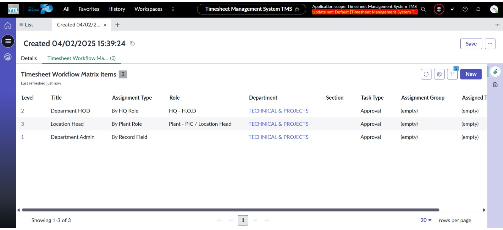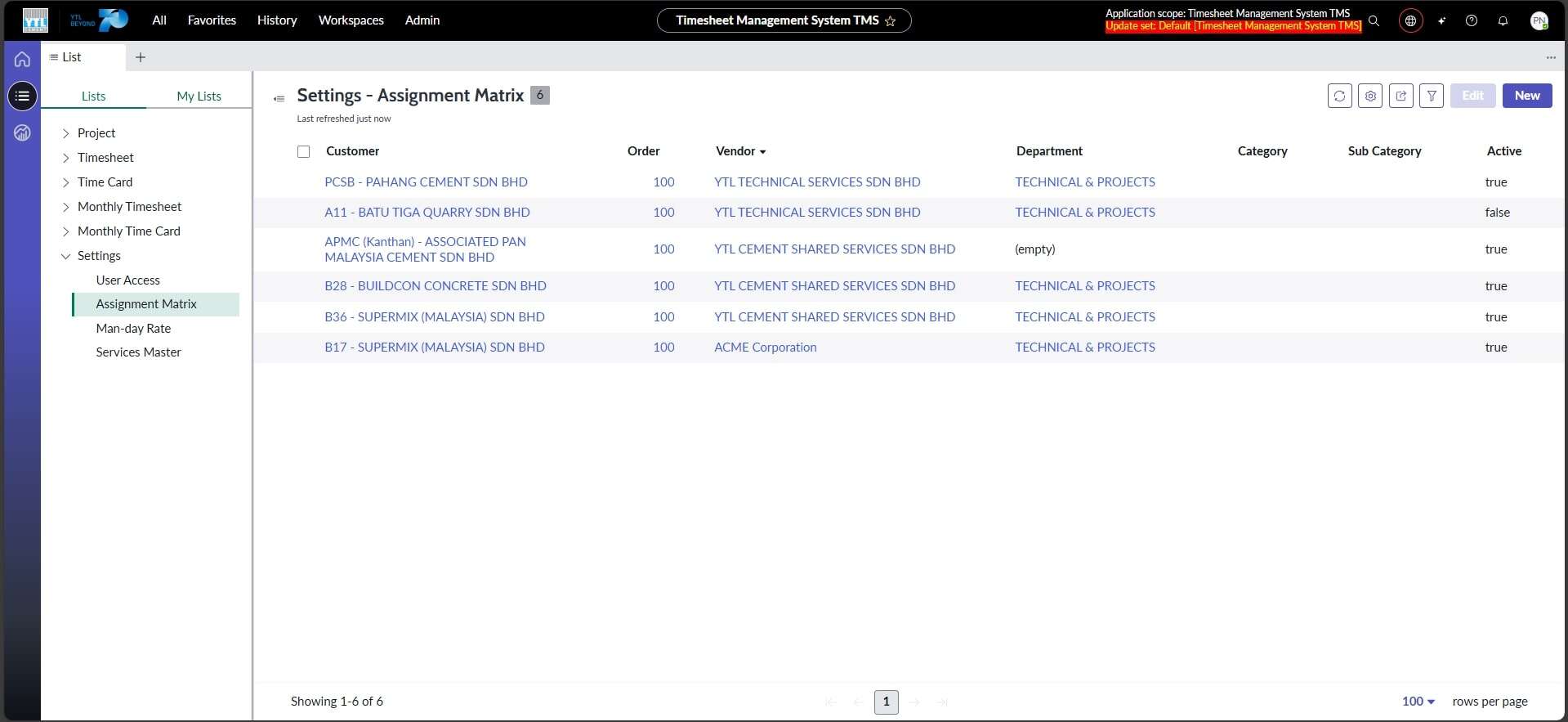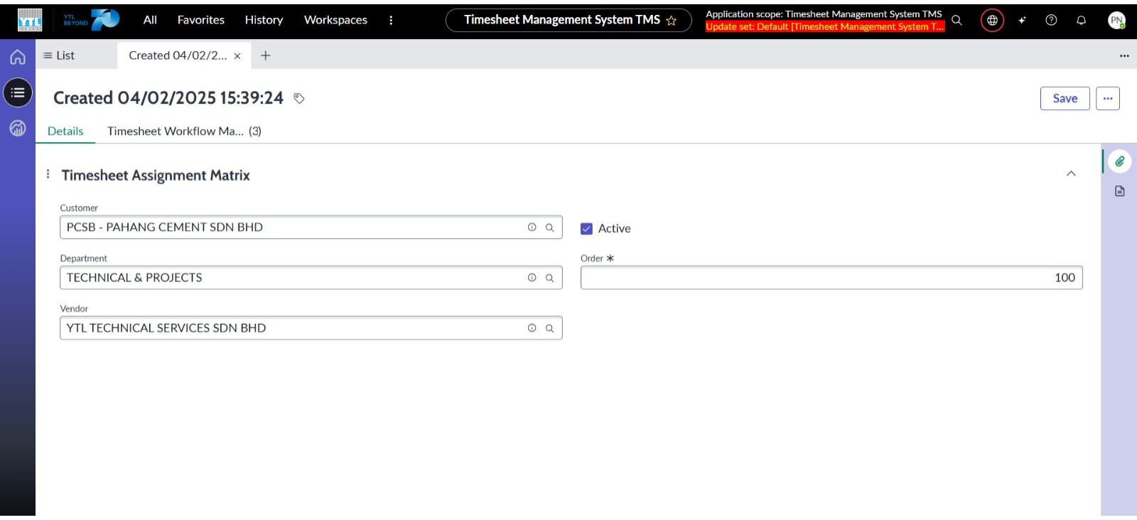 ● Cipta borang baharu Timesheet Assigment Matrix dengan medan iaitu Pelanggan, Jabatan, Syarikat dan Susunan serta “Checkbox” bagi Aktif.