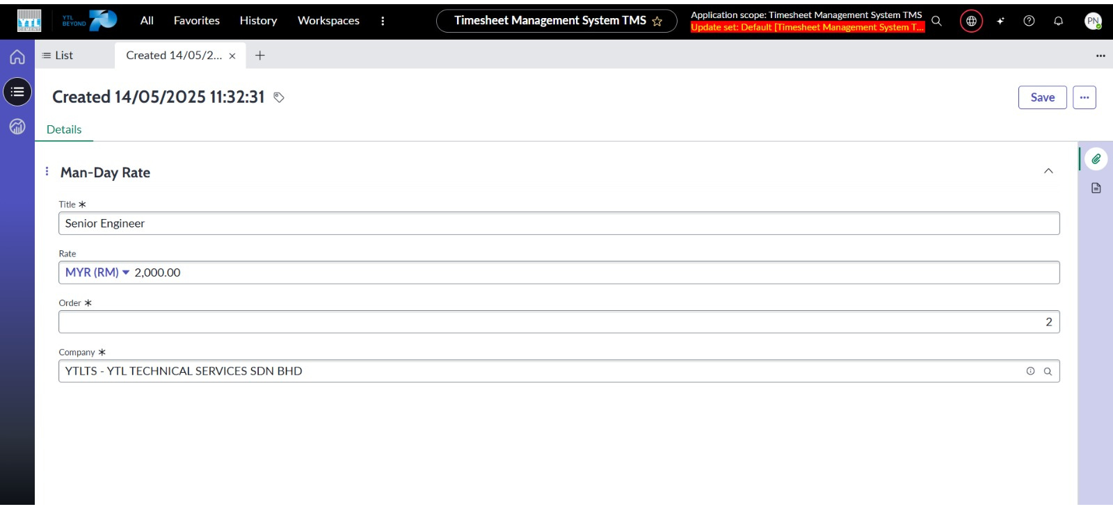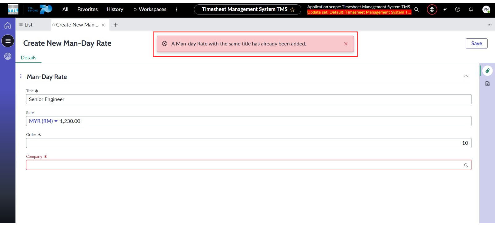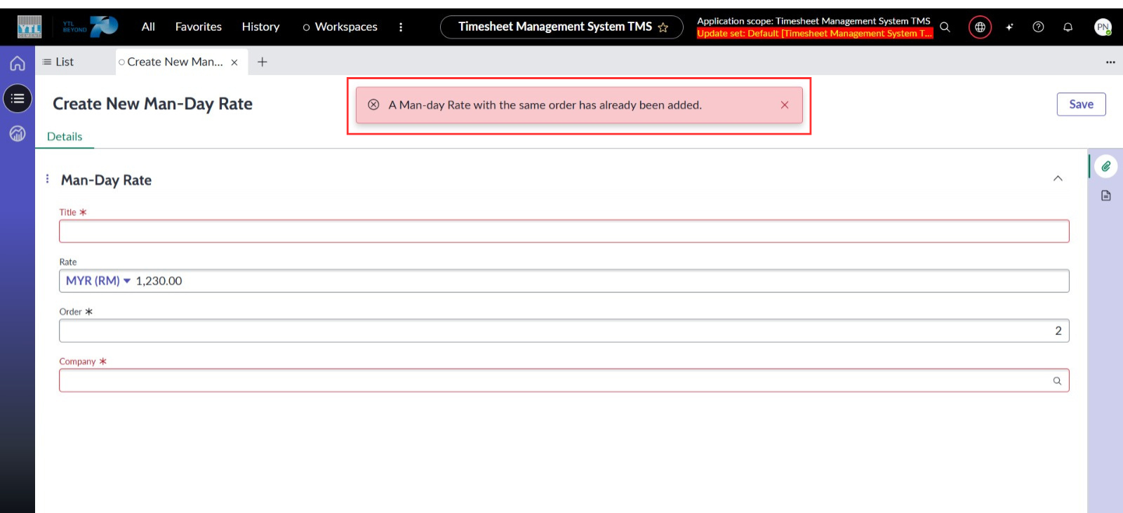 ● Menetapkan medan Jawatan, Susunan dan Syarikat sebagai medan wajib diisi semasa mencipta rekod Man-day Rate.