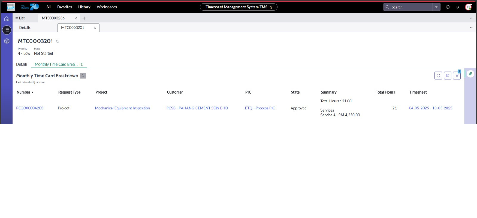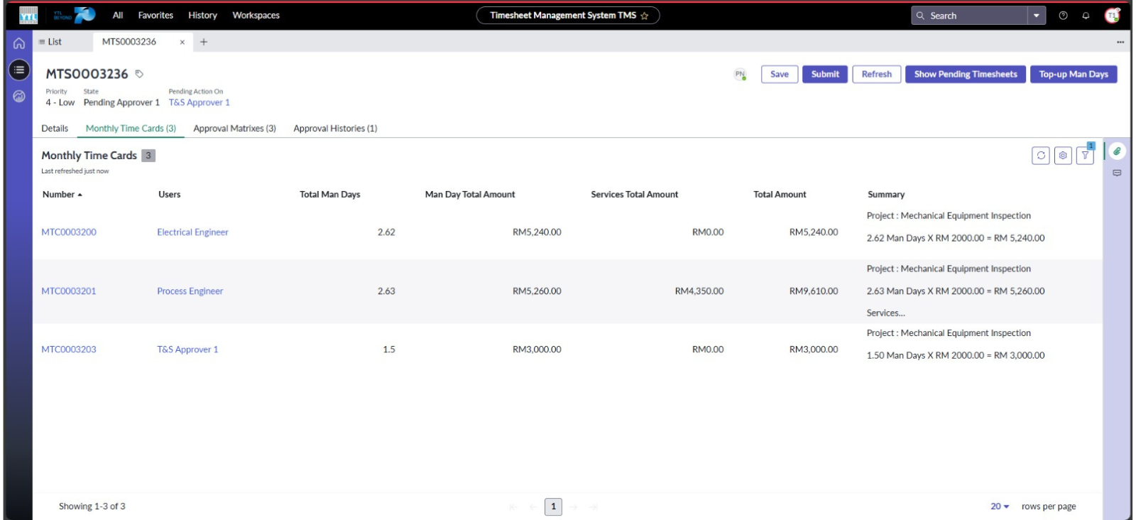 Monthly Timesheet (MTS) dijana secara automatik oleh sistem berdasarkan maklumat pelanggan (Customer) mengikut syarikat (Vendor) bagi pengguna yang telah melengkapkan dan mendapatkan kelulusan Timesheet mingguan mereka. Sistem akan mengumpulkan data tersebut dan memaparkan maklumat bulanan yang merangkumi Bulan, Syarikat, Pelanggan, Jabatan berkaitan serta Jumlah Keseluruhan Akhir. Melalui rekod Time Cards pengguna, sistem akan mengira secara automatik untuk Jumlah Man Days, Jumlah Keseluruhan Man Day, Jumlah Keseluruhan Servis dan Jumlah Keseluruhan. Paparan ini bertujuan untuk memudahkan proses semakan oleh pihak Department Admin sebelum dihantar kepada Department HOD, Location Head, dan Finance untuk pengesahan lanjut.