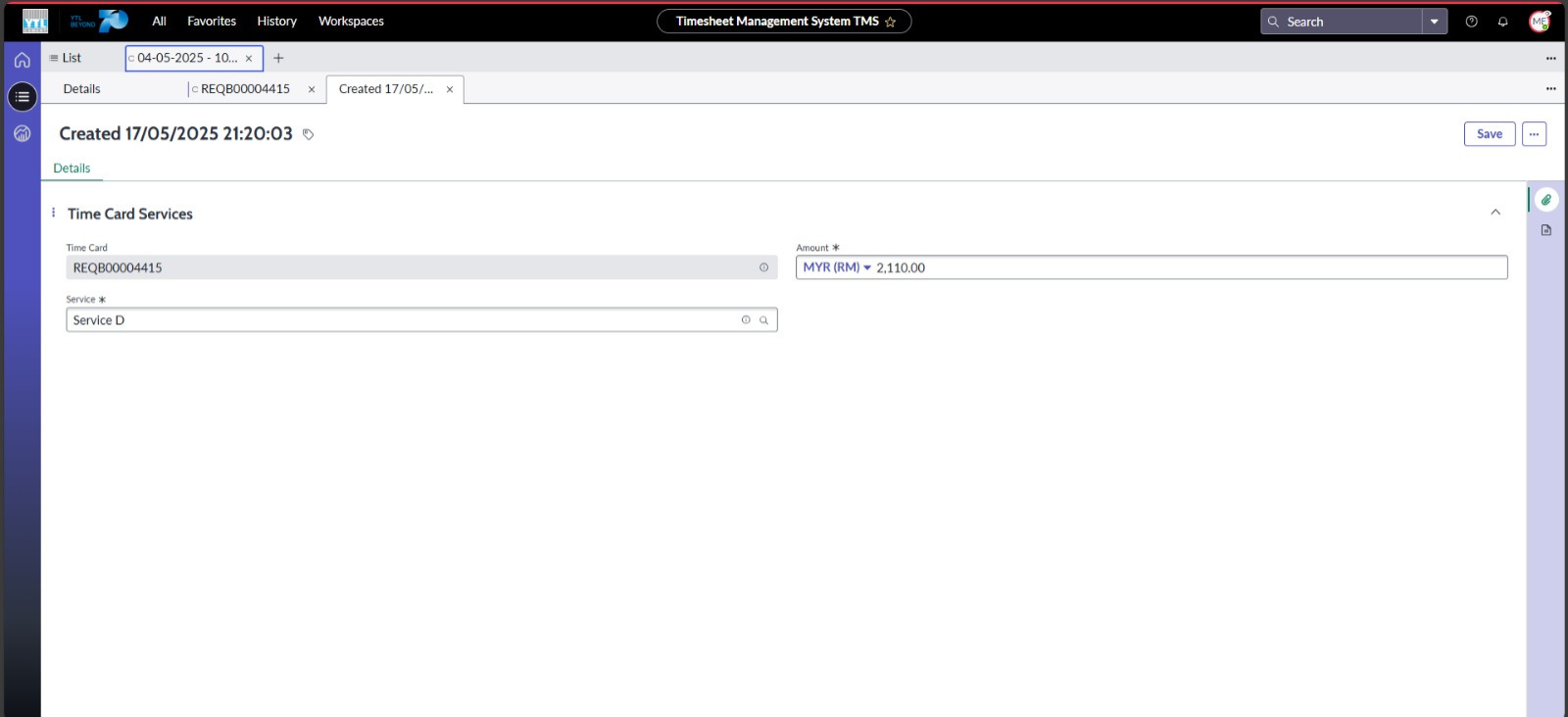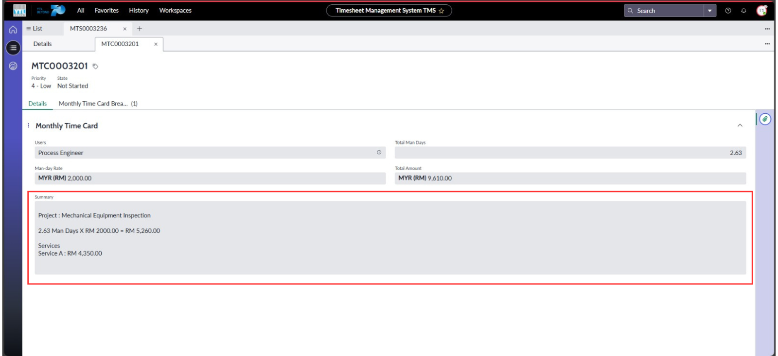 ● Setiap servis yang ditambah dan disimpan akan dikemas kini secara automatik dalam medan Summary di borang Time Cards untuk memaparkan senarai servis berserta amaun.