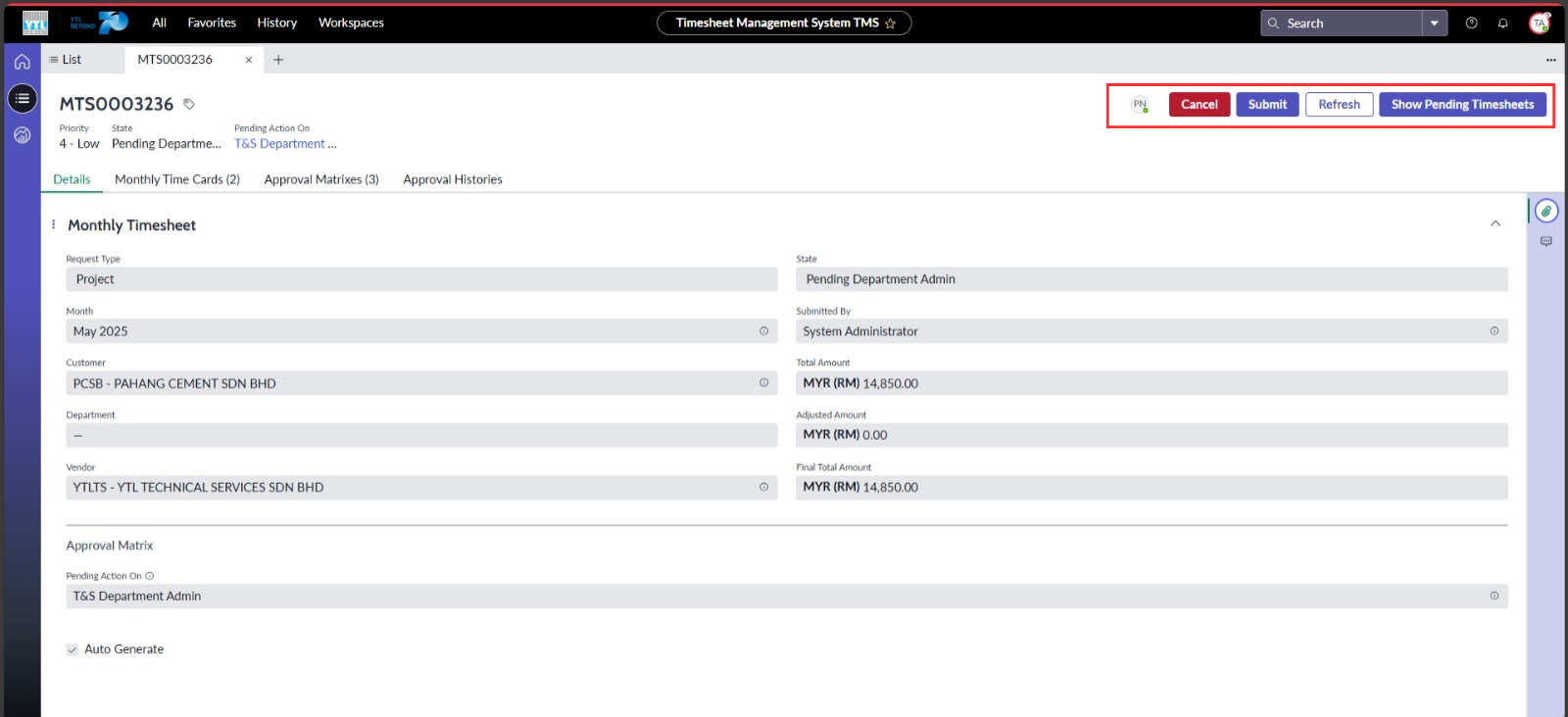 ● Tambah butang: “Submit”, “Cancel”, “Refresh” dan “Show Pending Timesheet”.