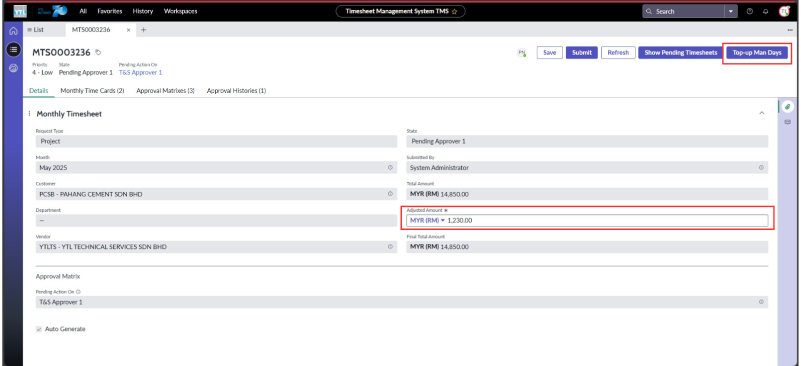 ● Cipta butang “Top-Up Man Days” untuk Department HOD bagi memaparkan halaman baru untuk cipta Time Cards tambahan menggunakan Timesheet yang auto status “Approved”.