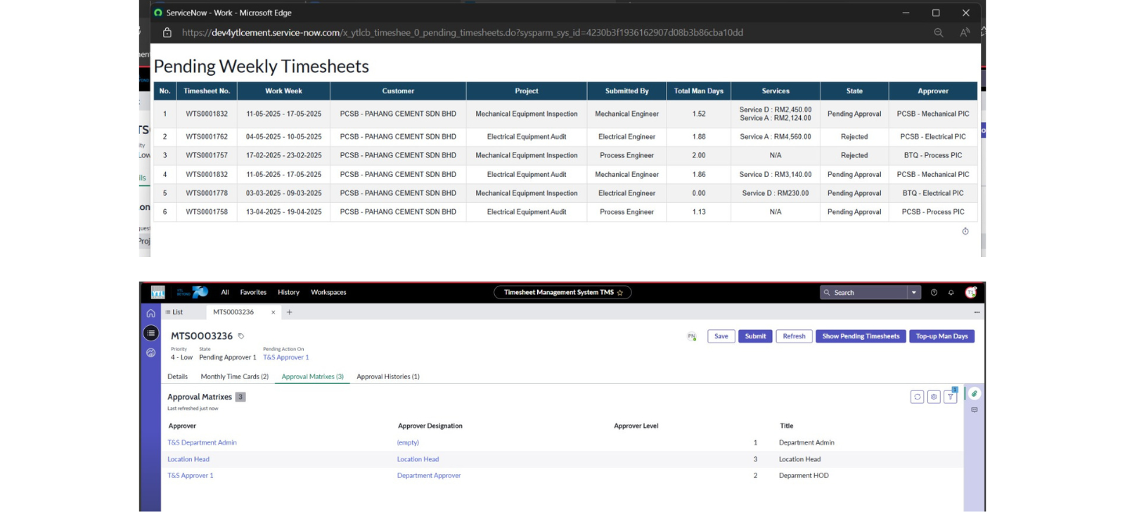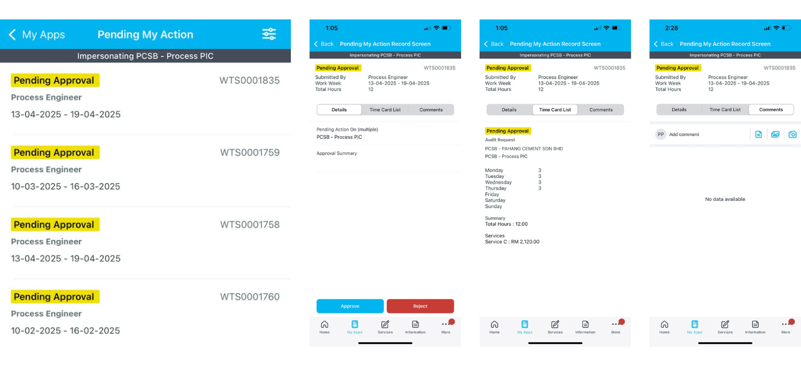 ● Baiki logik paparan medan “Pending Action On (Multiple)” agar memaparkan senarai “PIC (Person In Charge)” yang terlibat dalam proses kelulusan berdasarkan Time Cards apabila Timesheet berada dalam status “Pending Approval”, elakkan duplikasi nama jika pengguna sama, dan pastikan medan ini kosong jika Timesheet berada dalam status “Rejected”.