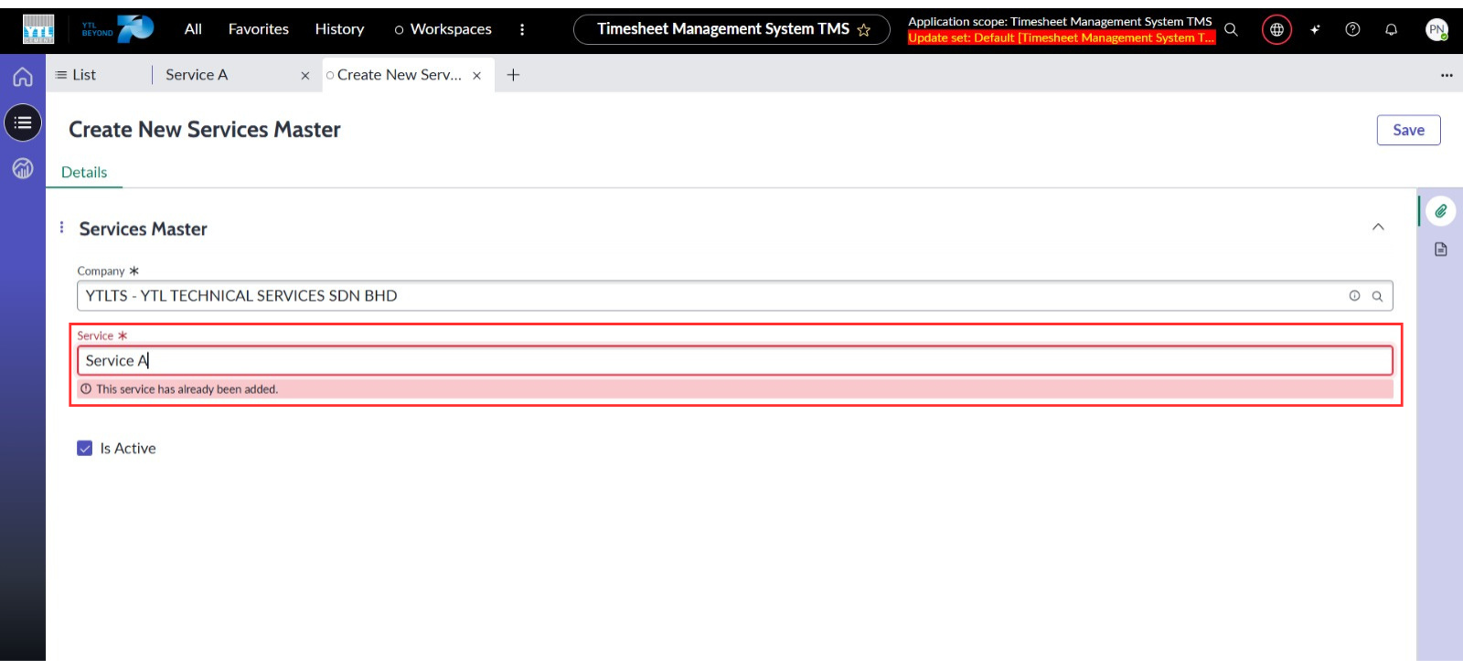 ● Menetapkan medan Syarikat dan Servis sebagai medan wajib diisi semasa mencipta rekod Services Master.