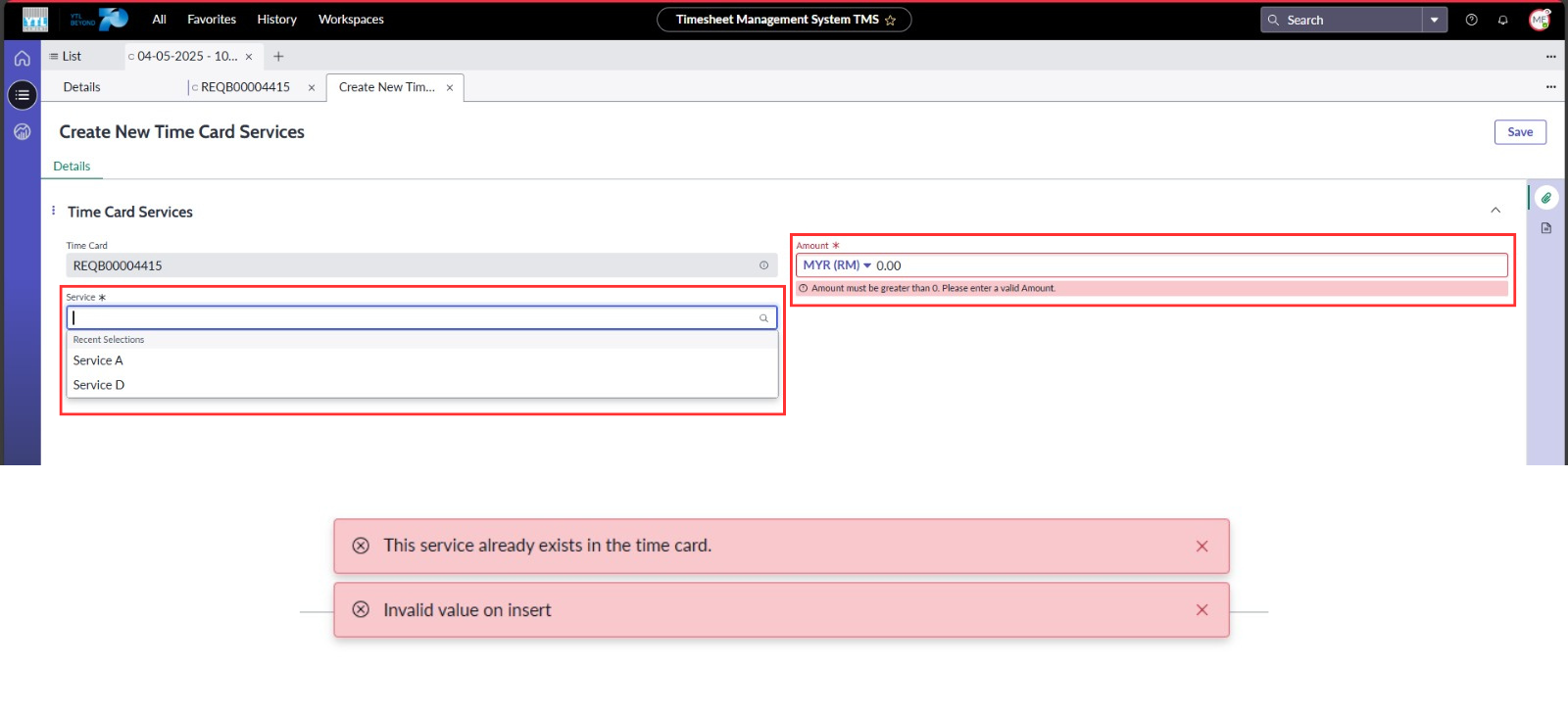 ● Tetapkan medan Time Cards sebagai tidak boleh disunting oleh pengguna, manakala medan Service dan Amaun ditetapkan sebagai wajib diisi sebelum simpanan boleh dilakukan.