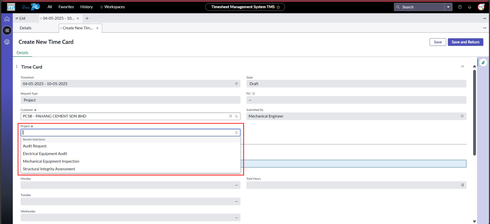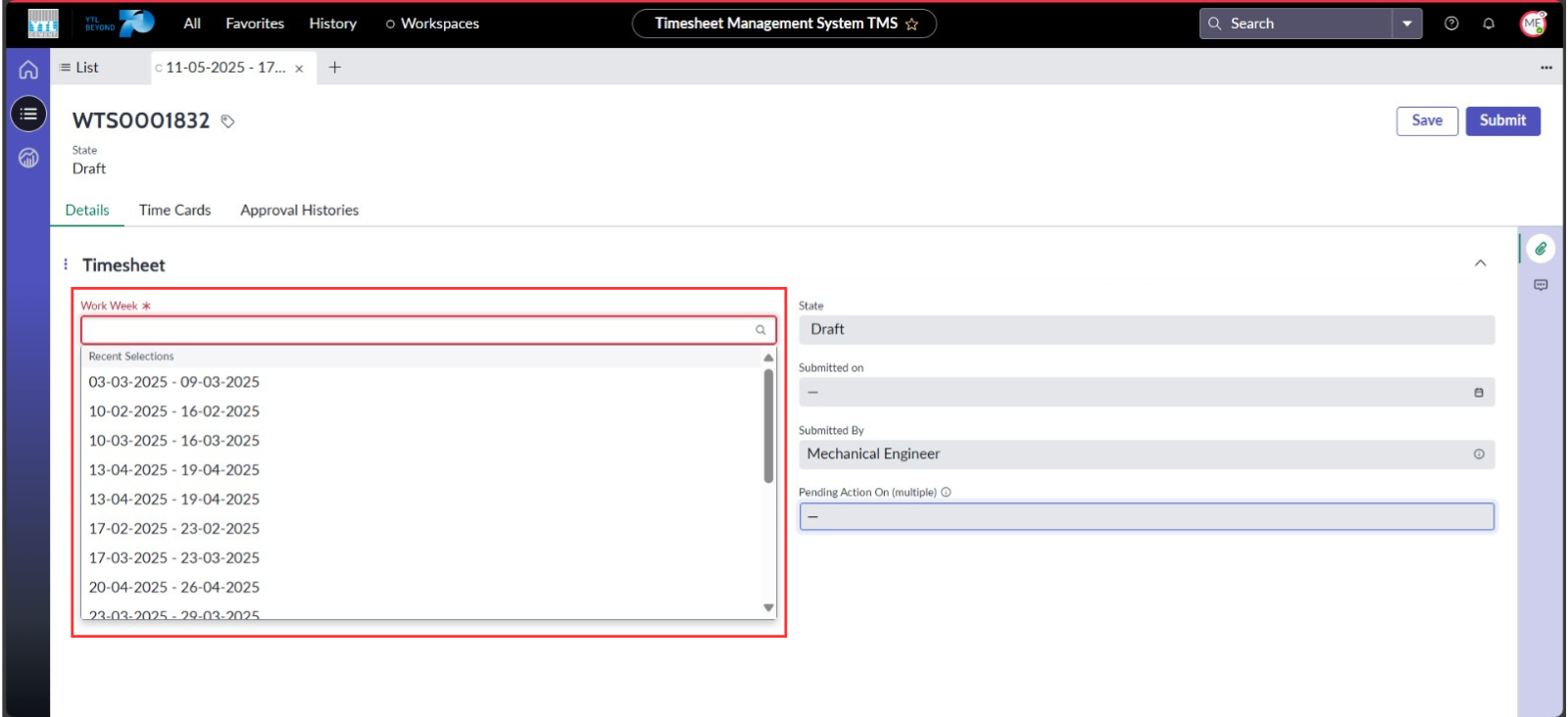 ● Hadkan pilihan “Work Week” kepada tiga bulan terakhir termasuk bulan semasa dan memastikan pengguna hanya boleh menetapkan satu “Work Week” bagi setiap Timesheet untuk mengelakkan pertindihan data. Medan ini juga ditetapkan sebagai perlu diisi sebelum penghantaran boleh dilakukan.