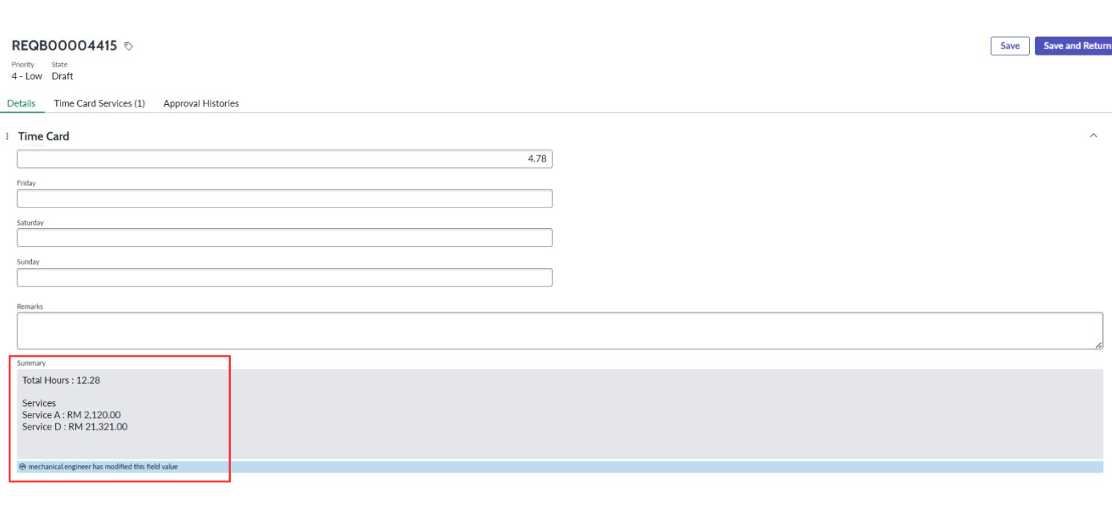 ● Kemaskini setelah pengguna mengisi Time Cards dan menekan butang “Save” atau “Save and Return”, medan Ringkasan akan dikemaskini secara automatik untuk memaparkan Jumlah Jam serta senarai servis yang terlibat.