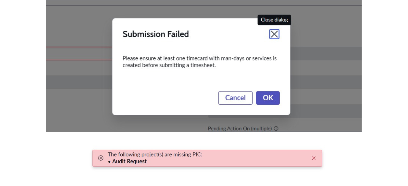 ● Semak fungsi butang “Submit” supaya hanya boleh diaktifkan jika semua Time Cards telah diwujudkan dan tiada Jumlah Jam bernilai sifar. Jika ada Time Cards dengan jumlah sifar, pengguna mesti nyatakan servis berkaitan. Selain itu, jika pengguna hantar Timesheet bagi projek tanpa PIC, sistem akan keluarkan mesej ralat dengan menyenaraikan projek-projek tersebut.