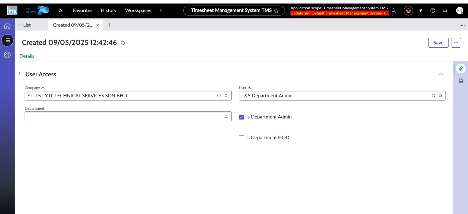 ● Cipta borang baharu User Access dengan medan iaitu Syarikat, Jabatan dan Pengguna serta “Checkbox” bagi adalah Department Admin dan adalah Department HOD.
