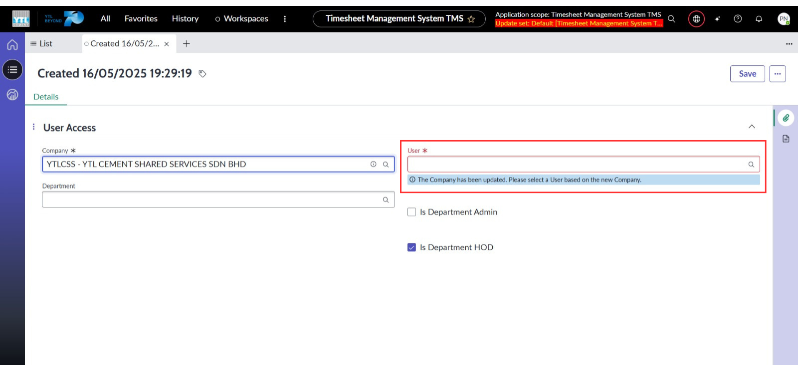 ● Menetapkan medan Syarikat dan Pengguna sebagai medan wajib diisi semasa mencipta rekod User Access.